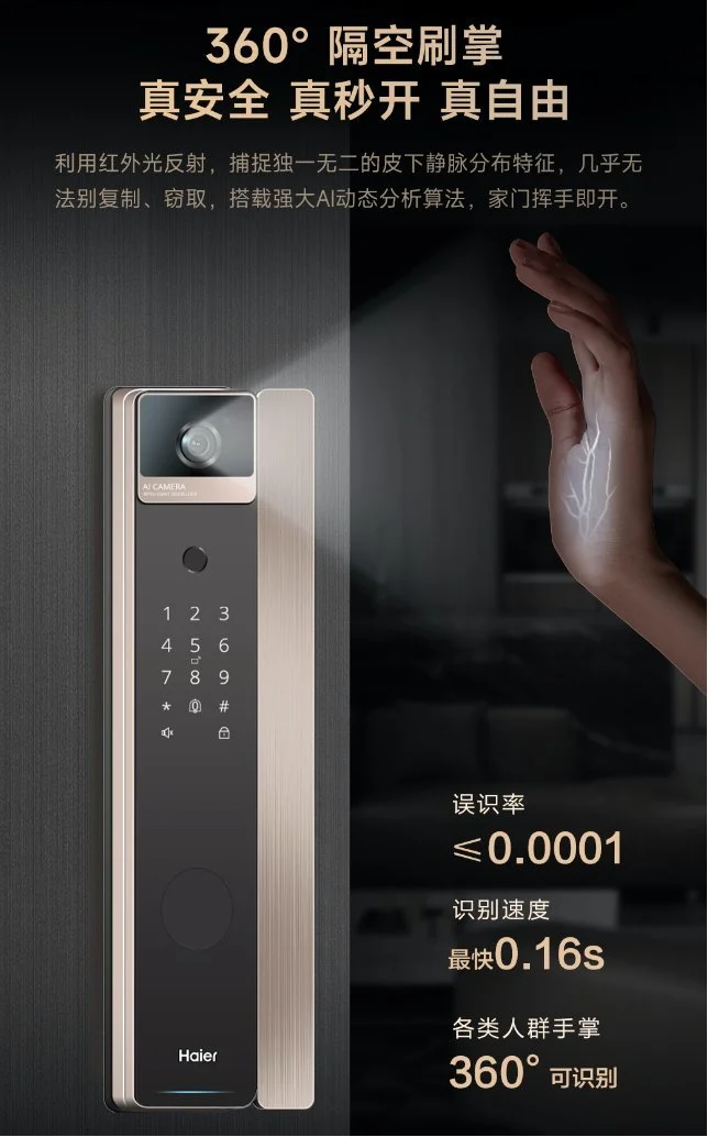 能被這么多用戶選擇,一方面是因為海爾智能門鎖相比傳統(tǒng)門鎖更加安全、便捷。拿海爾金吾衛(wèi)智能門鎖來說,這款產(chǎn)品具備AI多重生物識別技術(shù),滿足全家不同人的開鎖需求。小朋友不用踮腳,揮揮手門就開了;買菜回家大包小包騰不出手的你,刷臉就能進門;對指紋不清的爺爺奶奶也特別友好,手指一放就識別……