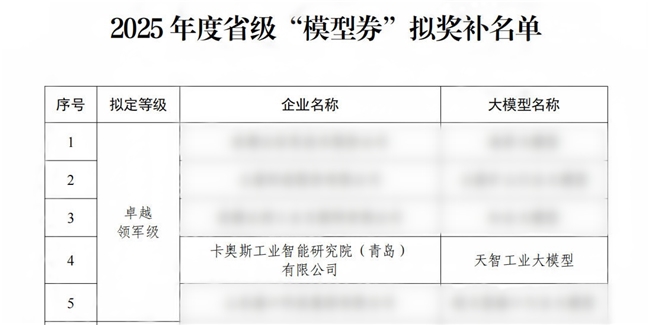 近日,山東省工業和信息化廳公布2025年度省級“模型券”獎補名單,全省共30個大模型項目入選。憑借在工業垂直領域的技術和實踐創新,卡奧斯天智工業大模型當選最高的“卓越領軍級”項目,將獲得省工信廳獎勵支持。